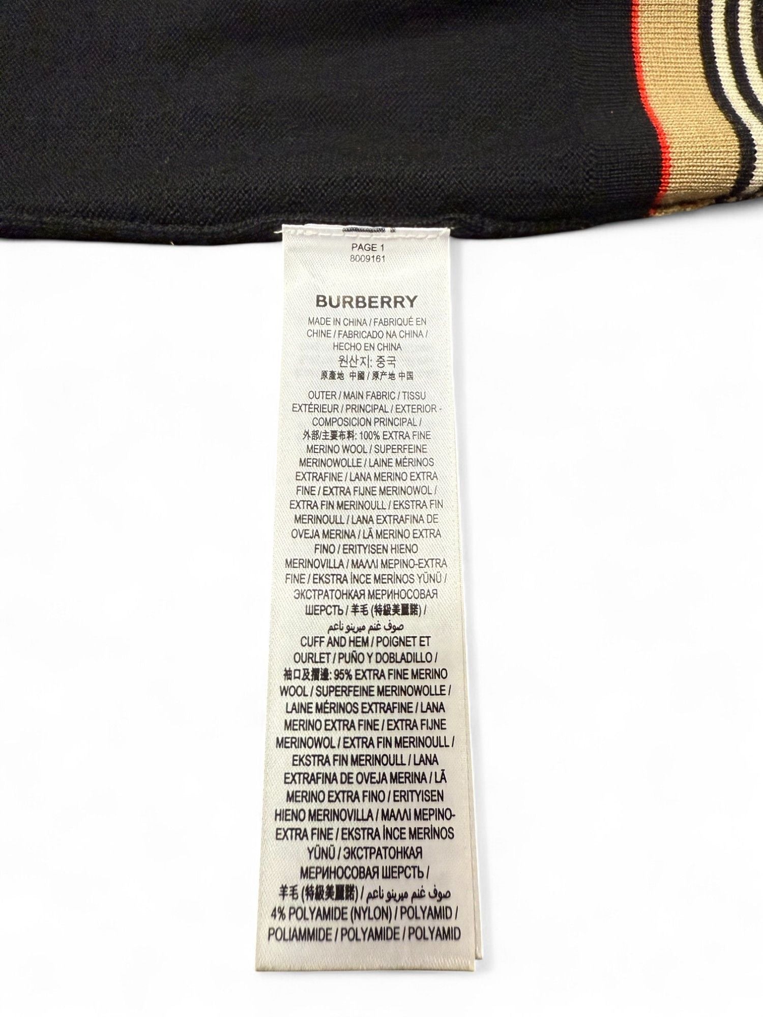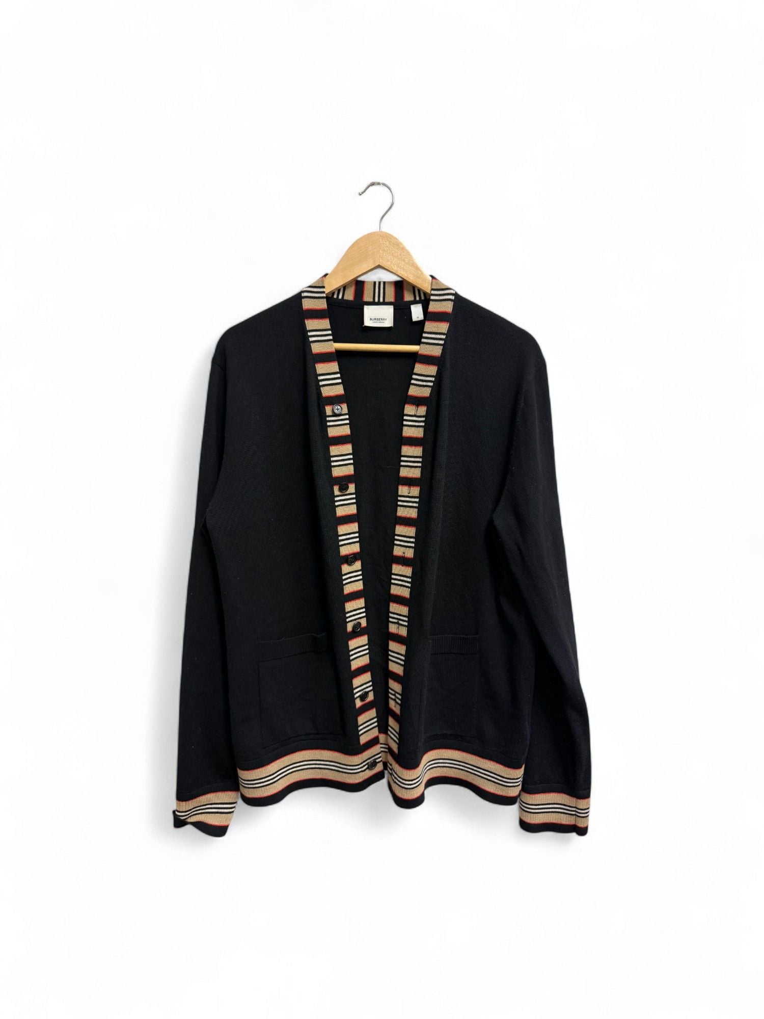 A quintessential blend of heritage and modernity, this Burberry cardigan showcases a sleek black wool base accentuated by the brand’s signature stripes in beige, brown, and black along the V-neckline, placket, cuffs, and hem. The mid-weight knit offers lightweight warmth, perfect for transitional seasons or layered over a crisp white shirt for smart-casual elegance. Designed with a tailored yet relaxed fit (Size M), it features a full button-front closure, two practical chest pockets, and ribbed trims for structure. The tonal stripes subtly reference Burberry’s iconic trench coat lining, bridging timeless British tailoring with contemporary ease.