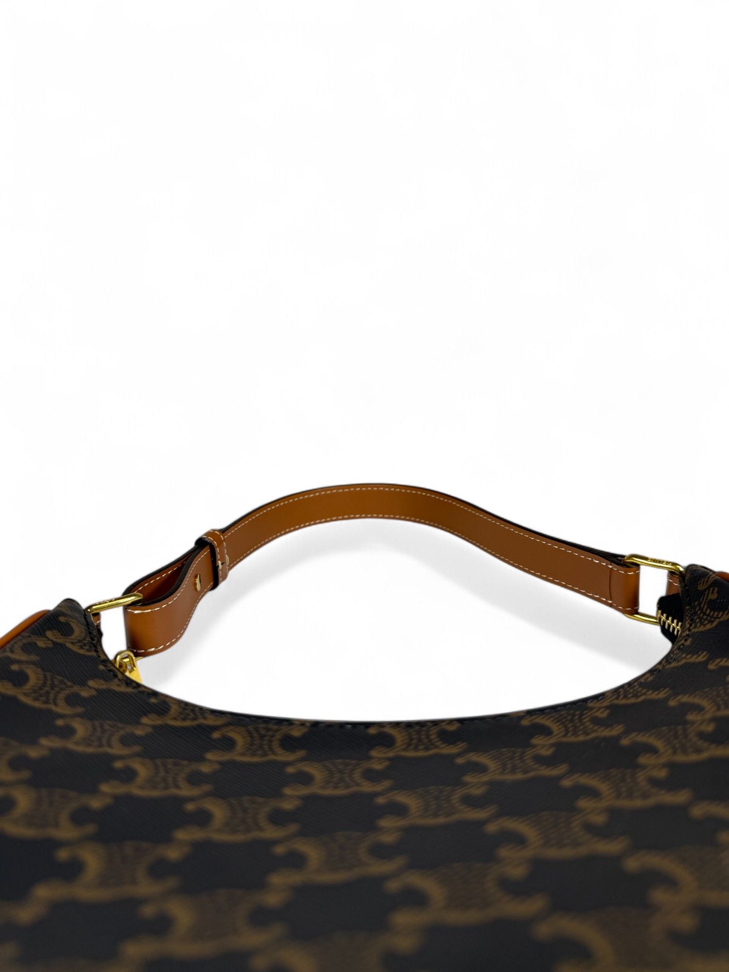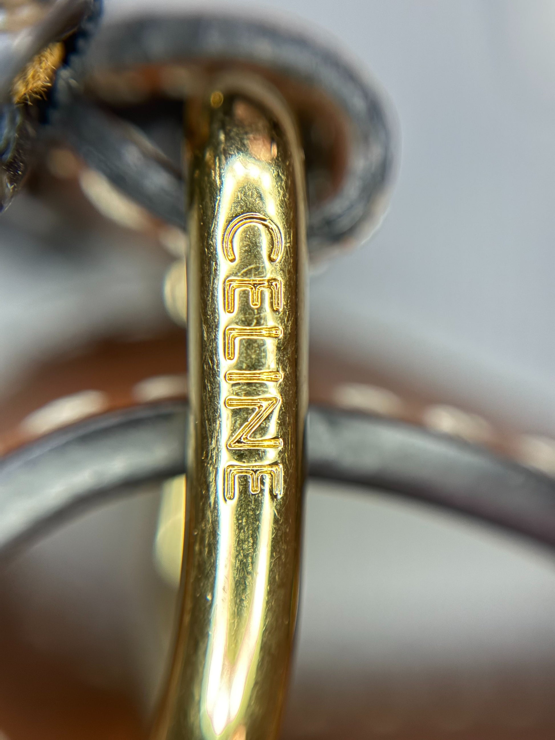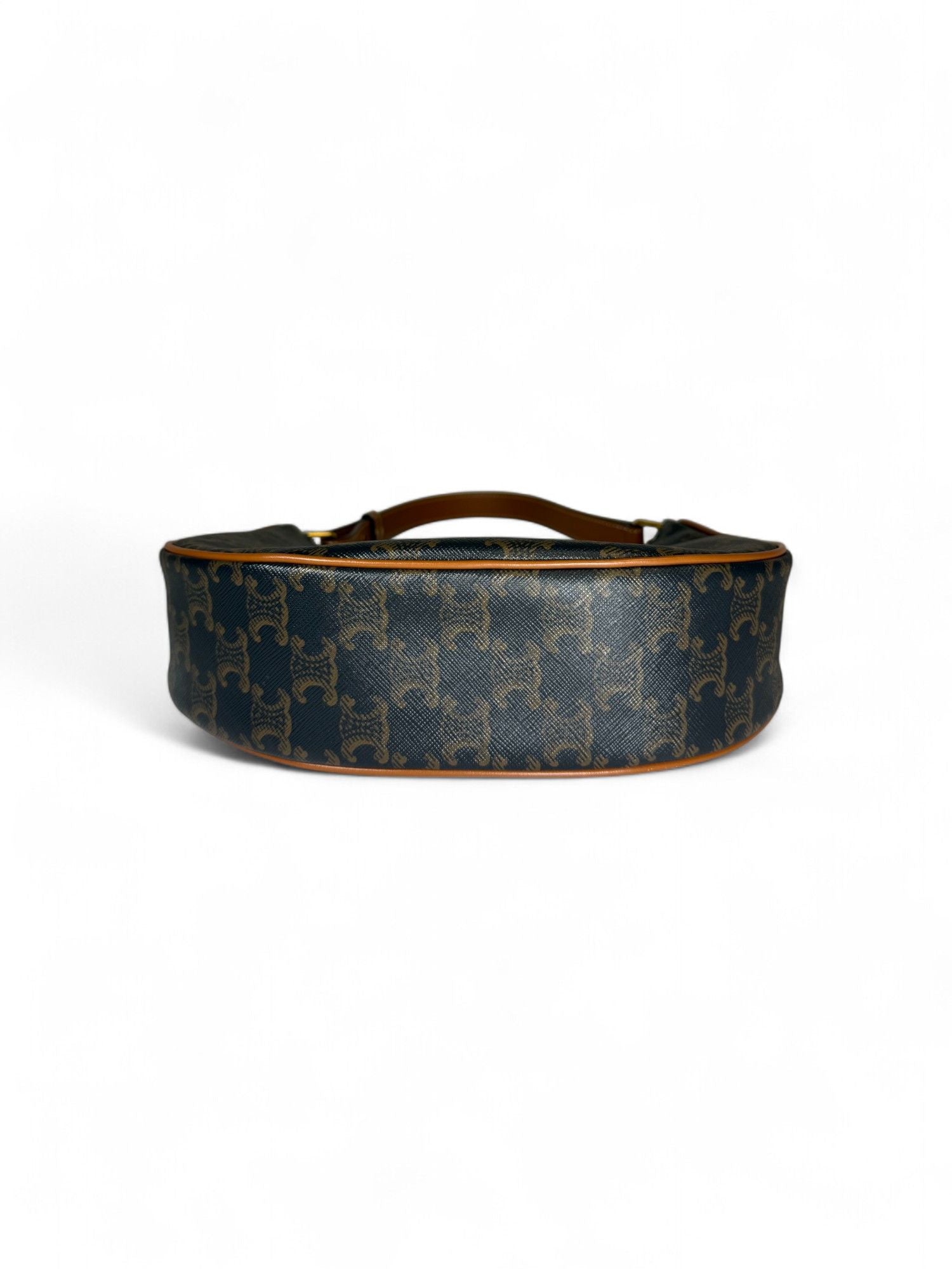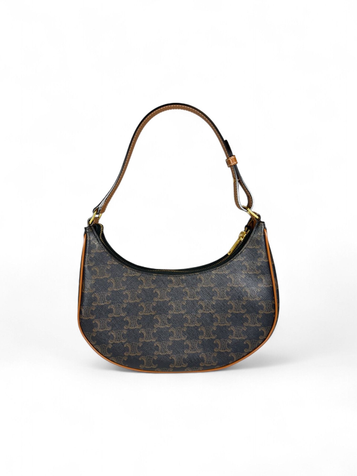 A vintage-inspired staple from Celine’s iconic Ava collection, this crescent-shaped crossbody bag is crafted in deep blue monogram-coated canvas, accented with rich brown leather trim and a polished gold-tone zipper. The compact silhouette features the brand’s signature Triomphe motif embossed subtly across the body, exuding retro Parisian charm. Its adjustable brown leather shoulder strap allows versatile wear—shorten for a chic underarm carry or lengthen for effortless crossbody styling. Lightweight yet structured, the bag’s interior offers ample space for essentials, secured by a smooth zipper closure with an engraved "CELINE" pull. Pair with tailored blazers and straight-leg jeans for a timeless ’70s vibe, or contrast its elegance with slip dresses and ankle boots for modern contrast. The neutral dark blue and brown palette ensures year-round versatility, transitioning seamlessly from daytime errands to evening soirées. A functional yet elevated piece that embodies Celine’s fusion of utilitarian design and quiet luxury—ideal for minimalist wardrobes seeking a touch of heritage sophistication.