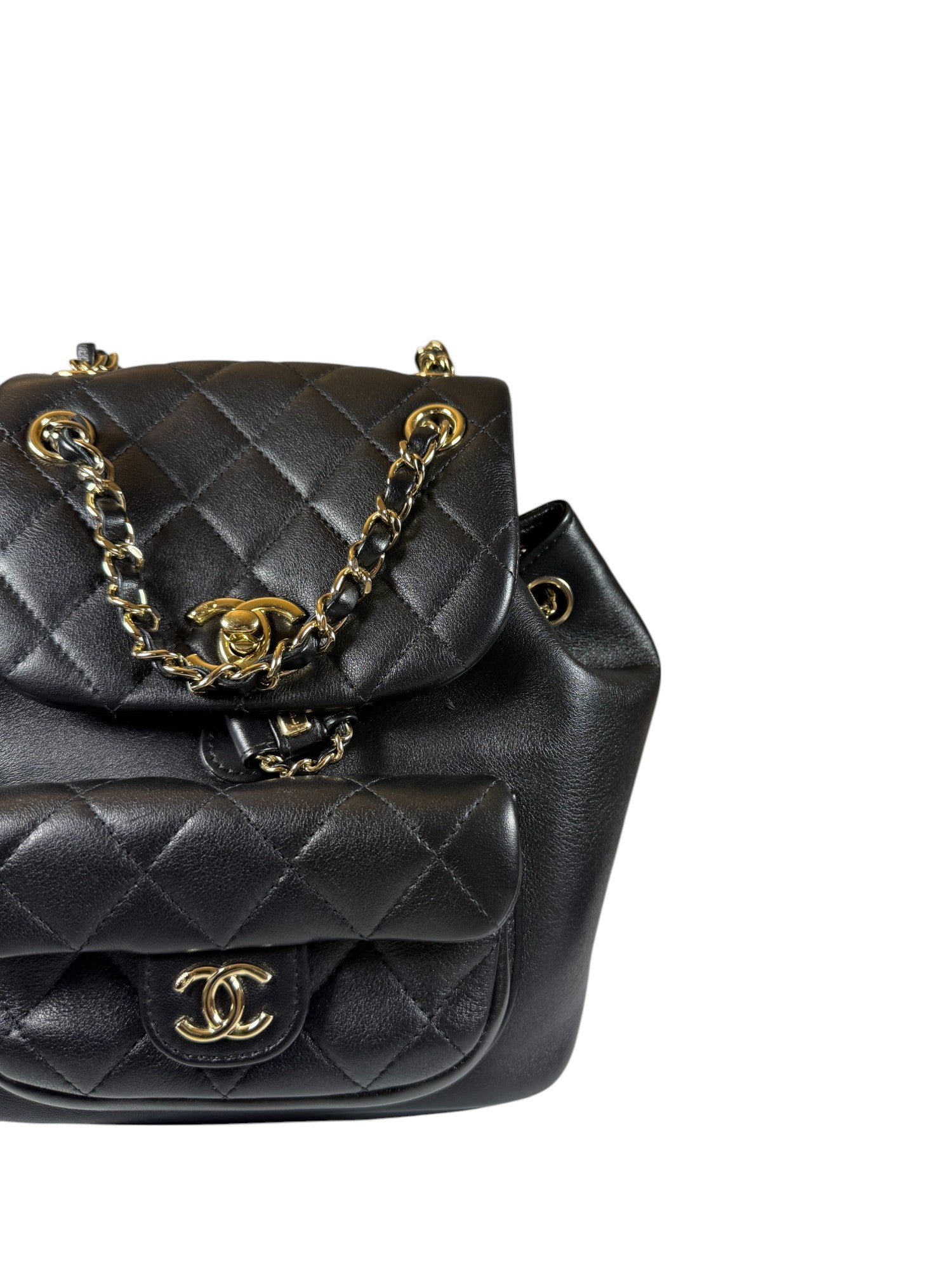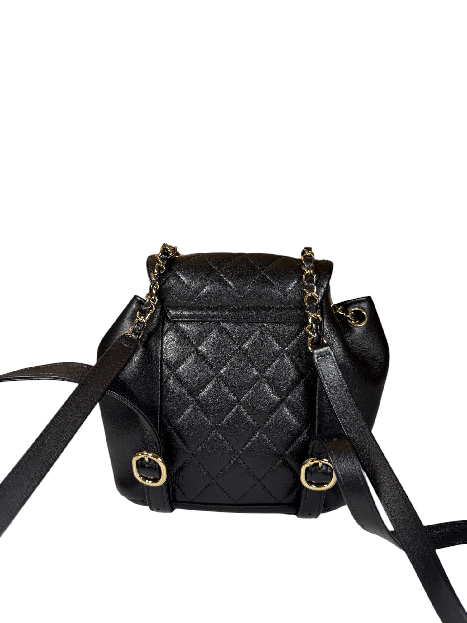 Iconic Chanel Duma backpack in black calfskin with gold-tone hardware and classic diamond quilting. Features flap closure with CC twist-lock and adjustable chain straps. A rare, timeless piece — perfect for daily wear or gifting.