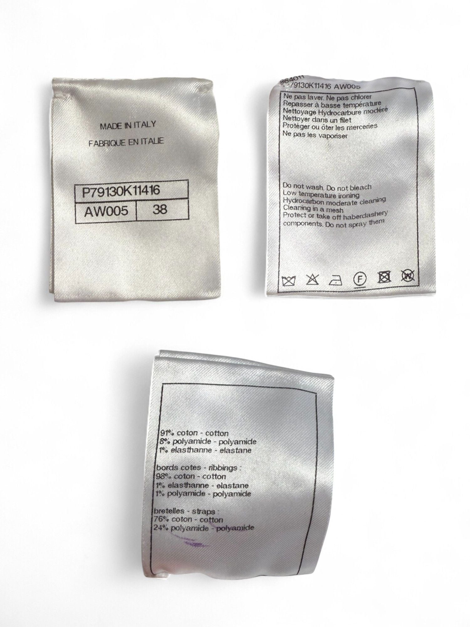 A sculptural masterpiece from Chanel’s 2025 Pre-Spring collection, this sleeveless tank reimagines minimalist elegance with its all-over 3D-knit lattice texture that casts delicate shadow play under light. The ultra-fine straps and clean lines create a barely-there silhouette, while the intricate weaving technique adds architectural depth without compromising drape. Presented on a black hanger crowned with the iconic gilt CC logo, its crisp white hue and textural surface contrast elevate it from basic layering piece to standalone statement. Versatile enough to anchor both day and night ensembles: layer under a bouclé tweed blazer for gallery-opening polish, or pair with high-waisted linen trousers and pearl-drop earrings for coastal-grandmother chic. Ideal for transitional seasons—wear solo with tailored shorts in late summer or beneath cashmere cardigans when autumn breezes arrive. Includes original attached white tag with barcode for authenticity verification. Shot against clinical white, the photography emphasizes its tactile dimensionality and precision engineering—a wearable canvas where haute couture techniques meet effortless cool.