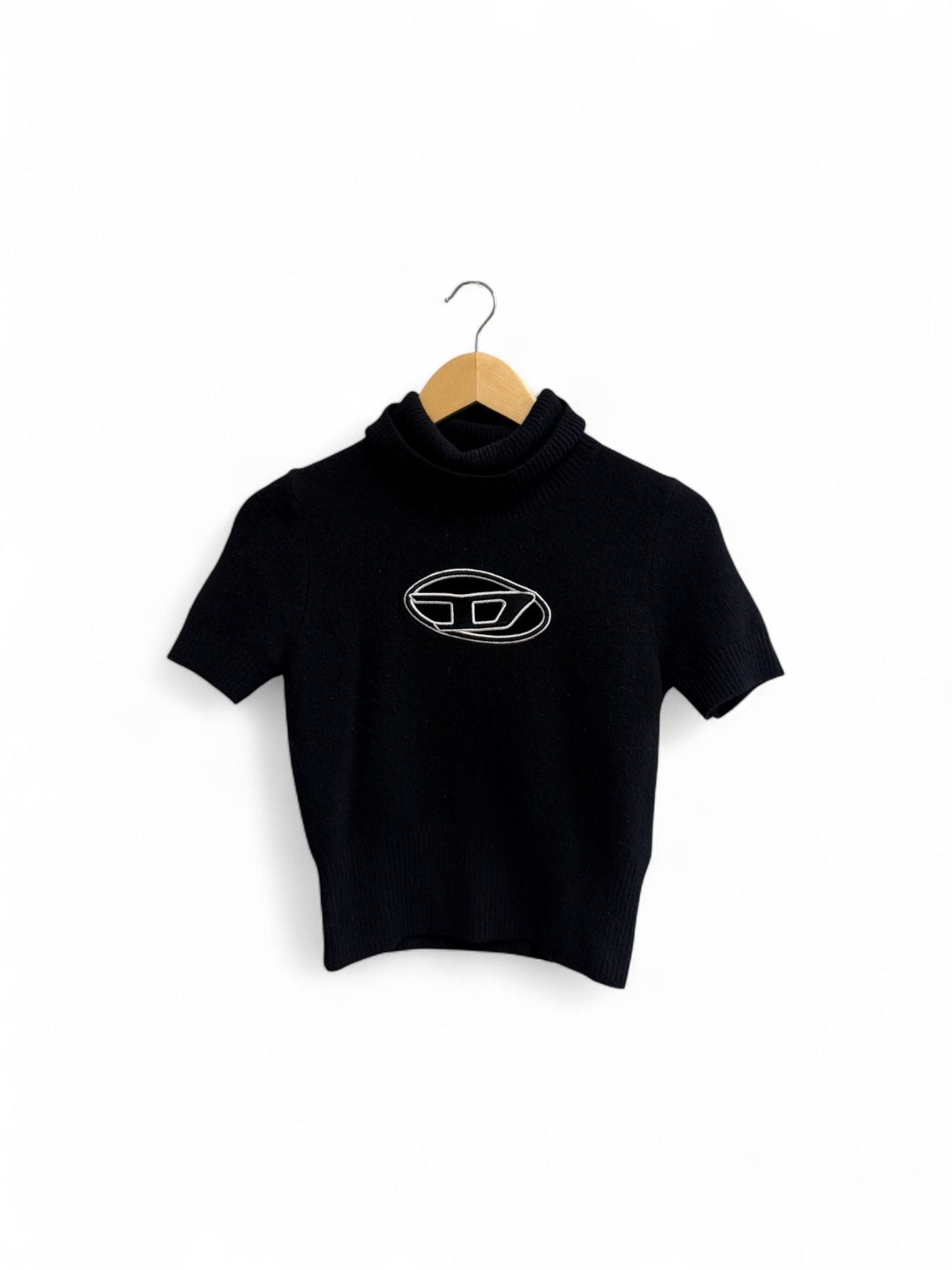 A sleek wardrobe staple from Diesel, this black short-sleeve knit top merges minimalist design with urban functionality. The high mockneck collar adds a sharp, modern edge, while the subtle white graphic print at the chest introduces a touch of understated boldness. Crafted from a medium-weight knit fabric, its slim-fit silhouette ensures a tailored yet comfortable drape, perfect for transitional spring and autumn weather. Layer it under a leather jacket for a street-ready look or pair with tailored trousers and loafers for smart-casual versatility. The neutral black hue and clean lines make it effortlessly adaptable—style with distressed denim and sneakers for daytime cool, or elevate with a metallic skirt and ankle boots for evening edge. Ideal for bridging seasons, its breathable knit balances warmth and airflow, suited for outdoor brunches, city strolls, or casual office wear. A timeless piece that embodies Diesel’s ethos of utilitarian chic, designed to anchor both monochromatic outfits and layered textures with equal flair.