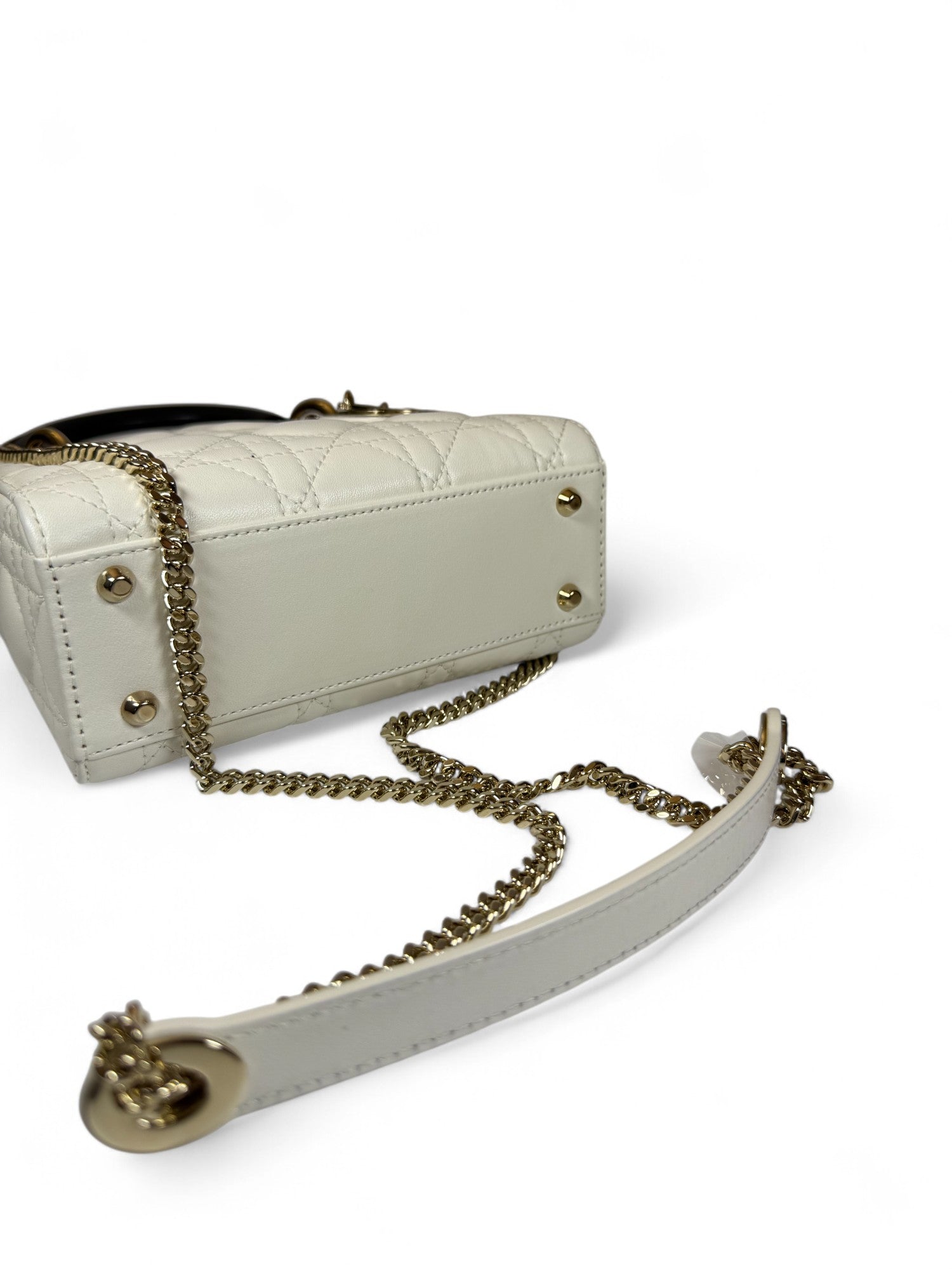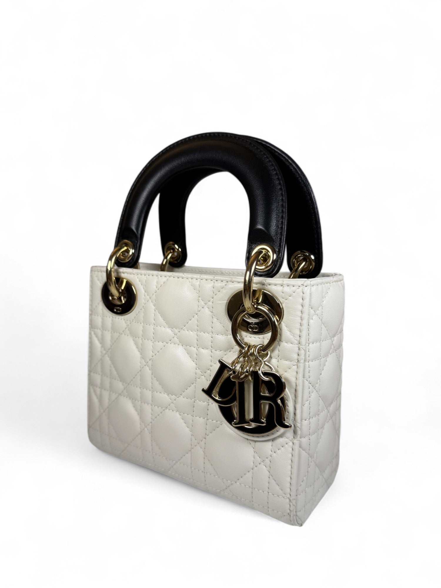 This Dior Lady Dior bag, introduced in 2025, showcases a unique design with three compartments, crafted from luxurious enamel-finished leather in classic black and white hues. The bag features the iconic Cannage motif and is adorned with the signature D.I.O.R. charms, epitomizing the brand's commitment to craftsmanship and elegance. This piece is brand new, unworn, and in pristine condition.