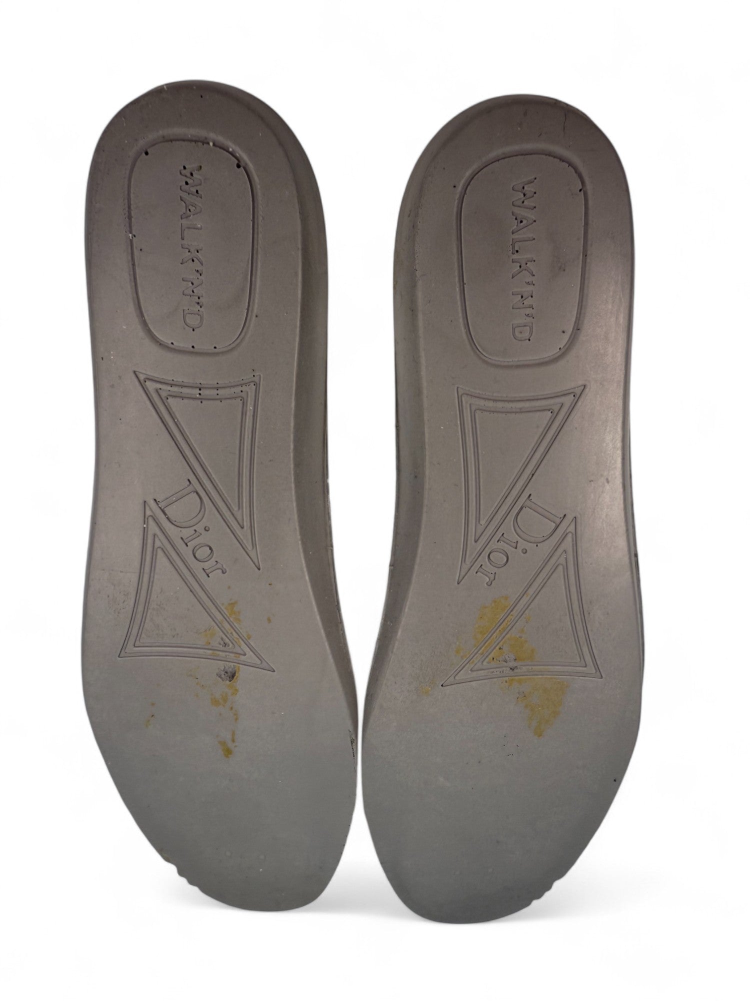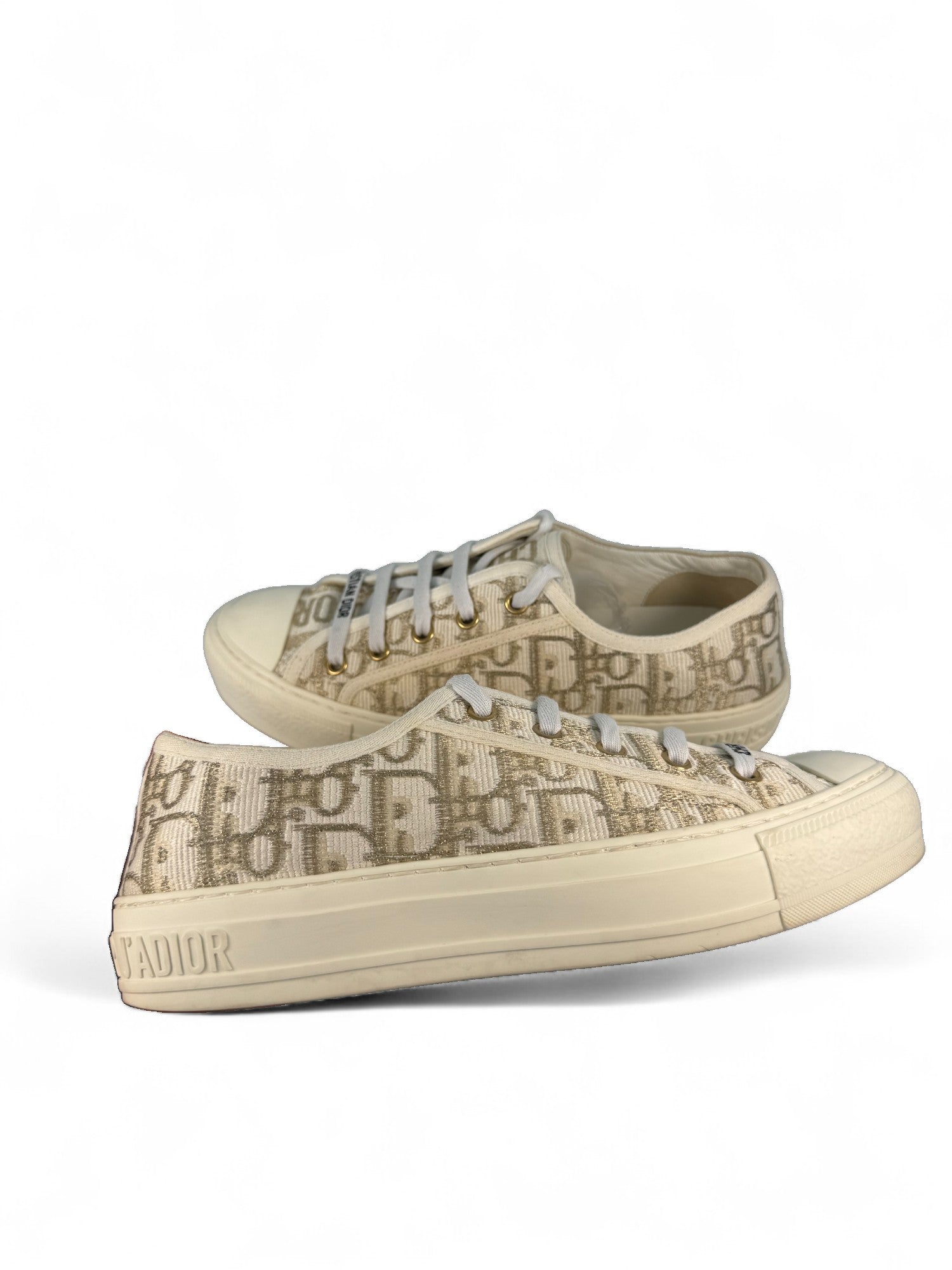 Step out in style with these Dior Walk’n’Dior platform sneakers, featuring a clean white cotton upper with subtle platinum accents for a luxurious yet sporty look. The round toe and lace-up design ensure a comfortable, secure fit, while the chunky sole adds trendy height and cushioning. Perfect for pairing with casual dresses, jeans, or athleisure wear, these low-top sneakers elevate any outfit effortlessly. Gently worn and in excellent condition.