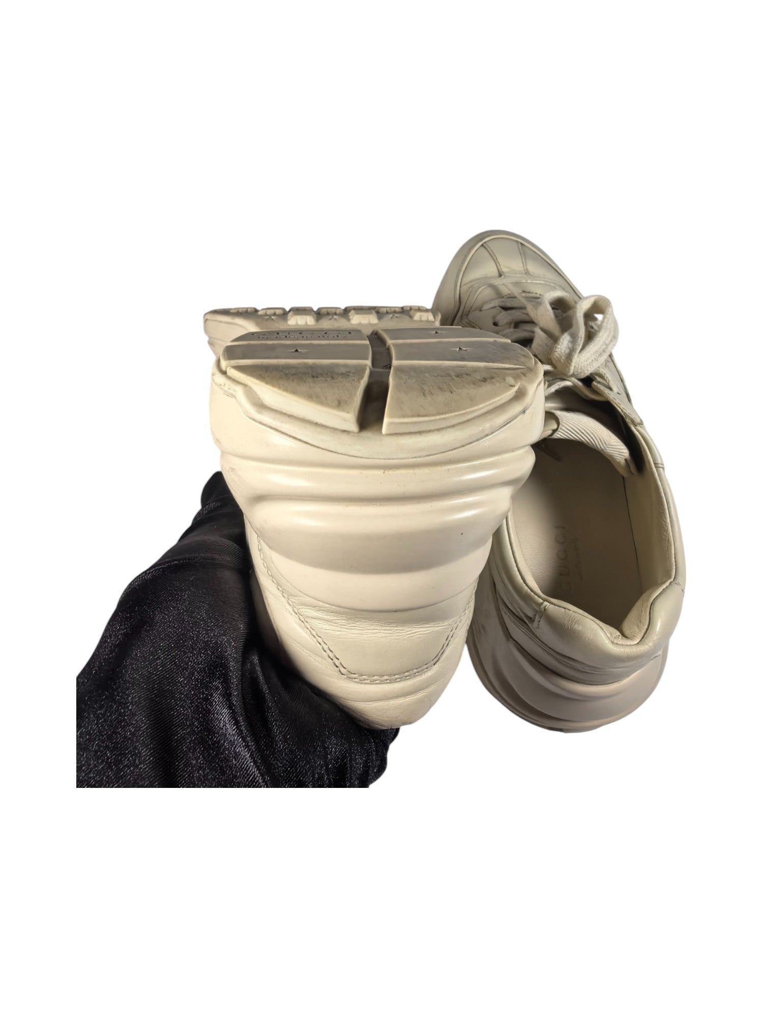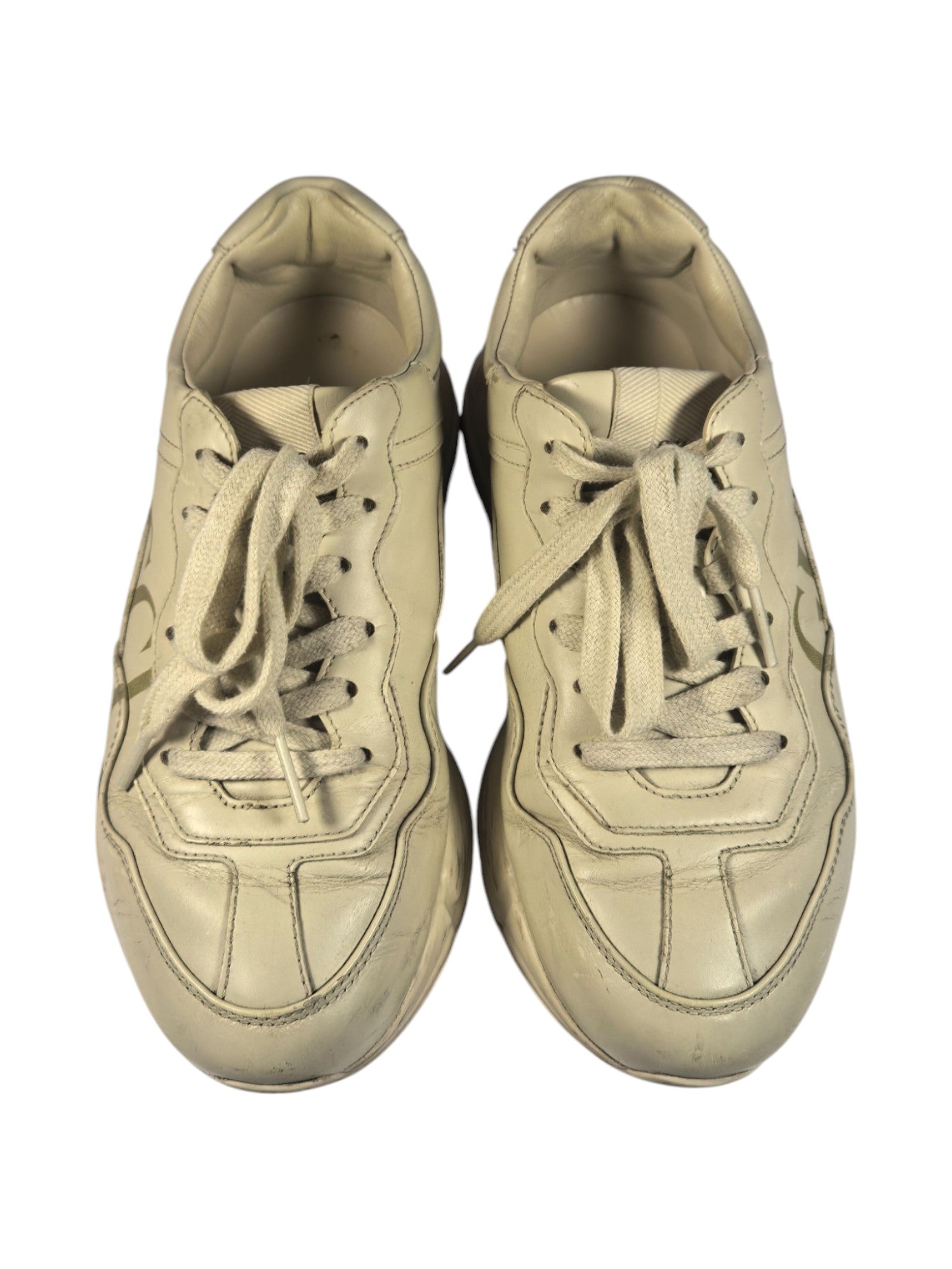 Gucci Rhyton Logo Sneakers - Ivory Leather with Web Stripe | Retail Price: $1,150From Gucci’s signature Rhyton collection, these sneakers are crafted in soft ivory-toned leather and feature the classic oversized Gucci logo print with green-red-green web stripe detailing along the side. The chunky silhouette delivers retro '90s appeal while offering a modern statement look. Designed with a lace-up front, padded collar, and thick rubber sole for comfort and durability, this size 35 pair is perfect for casual wear with an edge. DM for more information and photos!