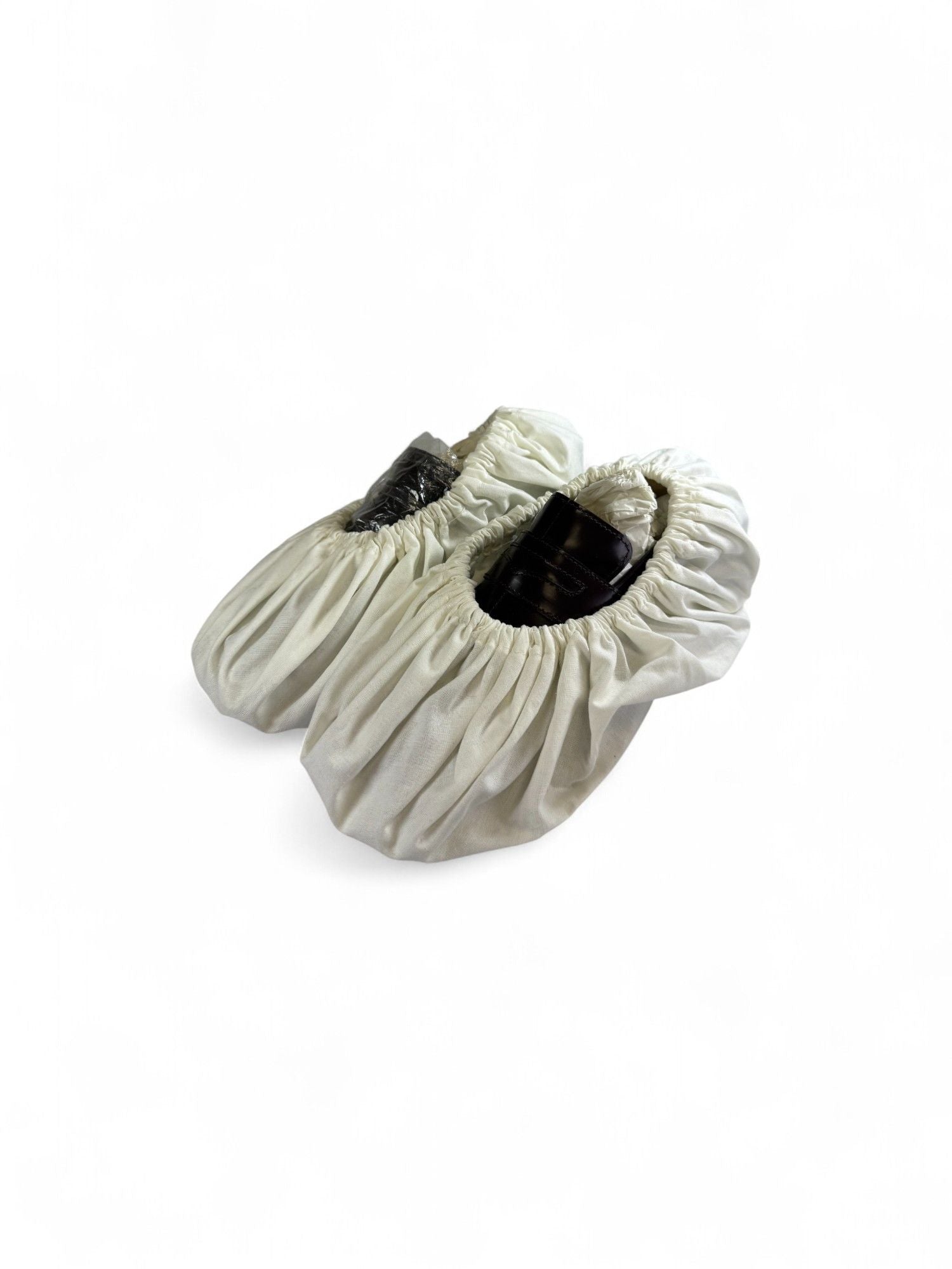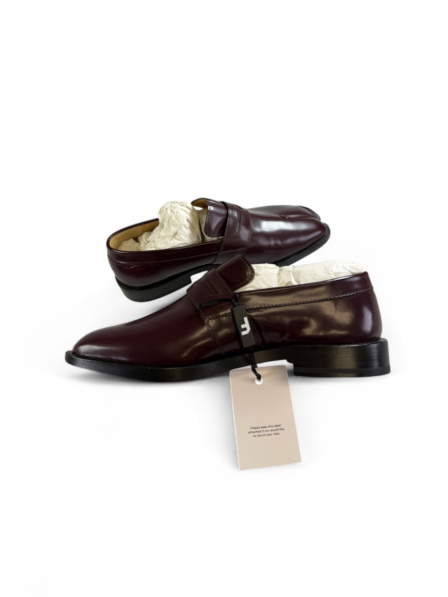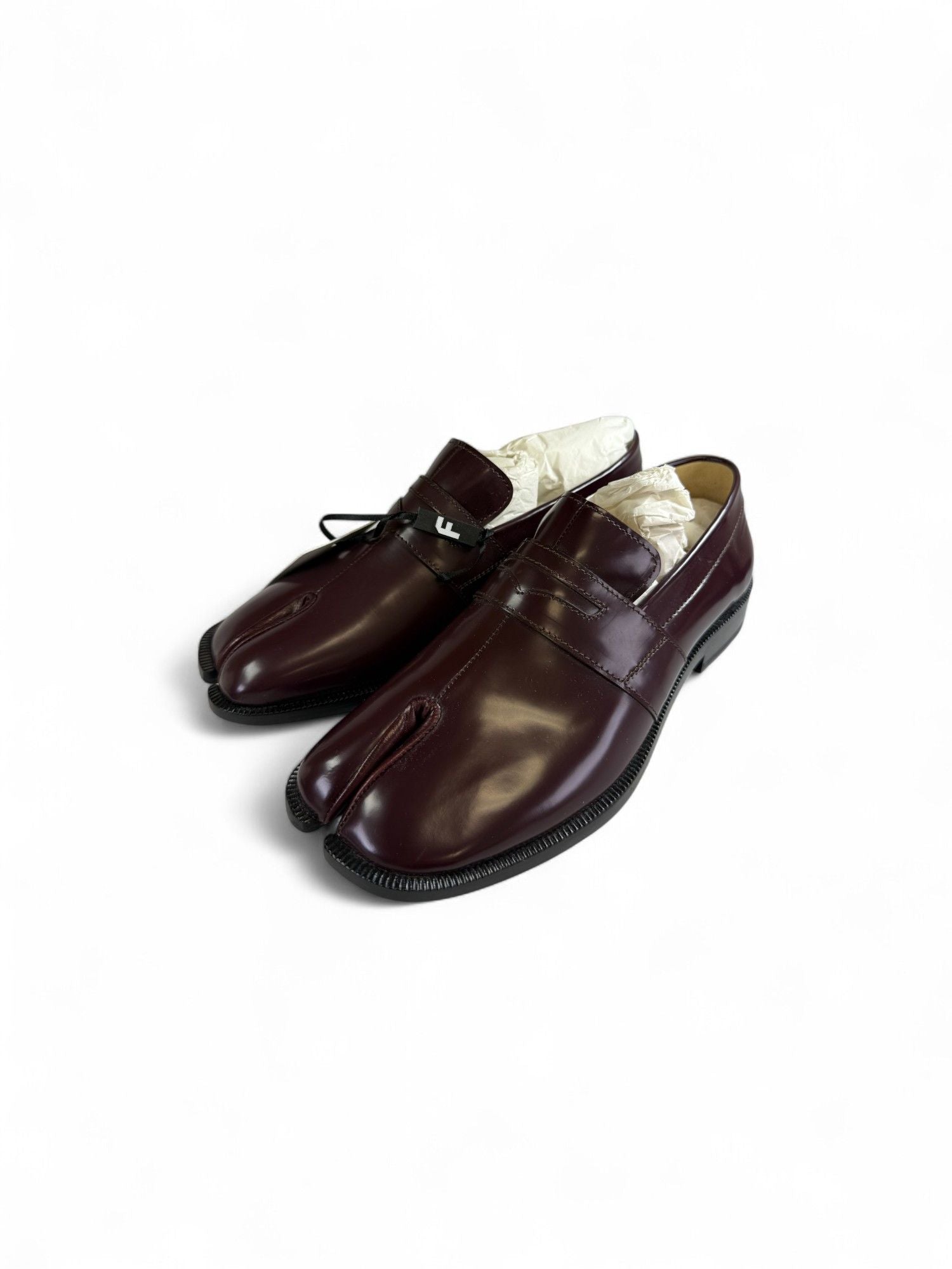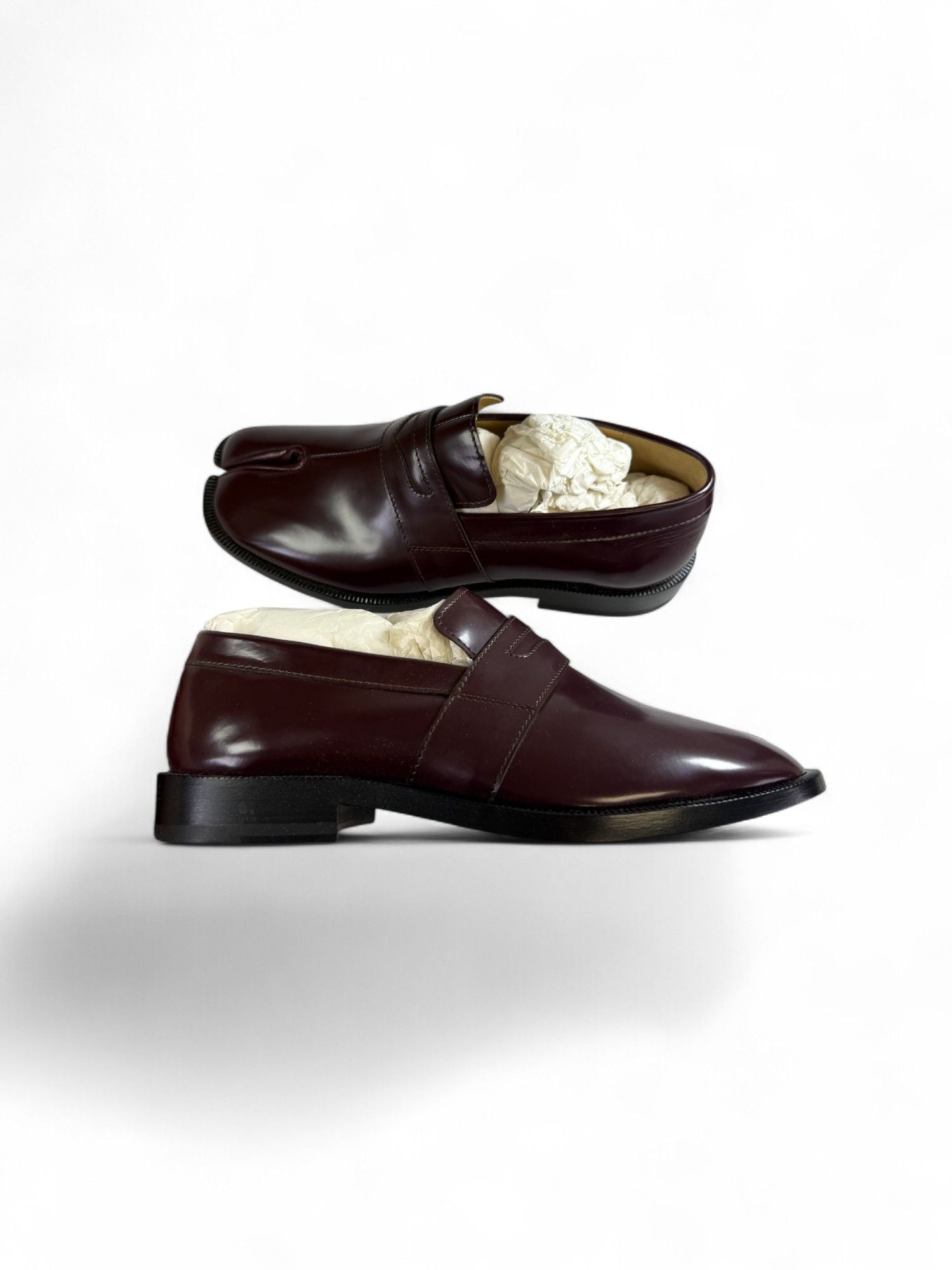 A defining icon of Margiela’s avant-garde ethos, these split-toe Tabi ankle boots reimagine Japanese tradition with subversive modernity. Crafted in Italy from glossy black leather, the sculptural silhouette features the brand’s signature bifurcated toe design (first debuted in 1988) and matte-black cotton laces for tactile contrast. The chunky sole balances urban practicality with runway-ready edge, ideal for styling with cropped tailored trousers to accentuate the Tabi split or layered under wide-leg denim for stealthy drama. Glossy leather resists scuffs, adapting seamlessly from gallery exhibitions to dimly lit bars. Pair with sheer socks to highlight the toe’s architectural silhouette, or contrast against minimalist monochrome looks for instant avant-garde impact. US 6.5 (EU 37.5) ensures true-to-size wear. A cult-favorite emblem of Margiela’s obsession with deconstructing classics, reborn in liquid-black allure.