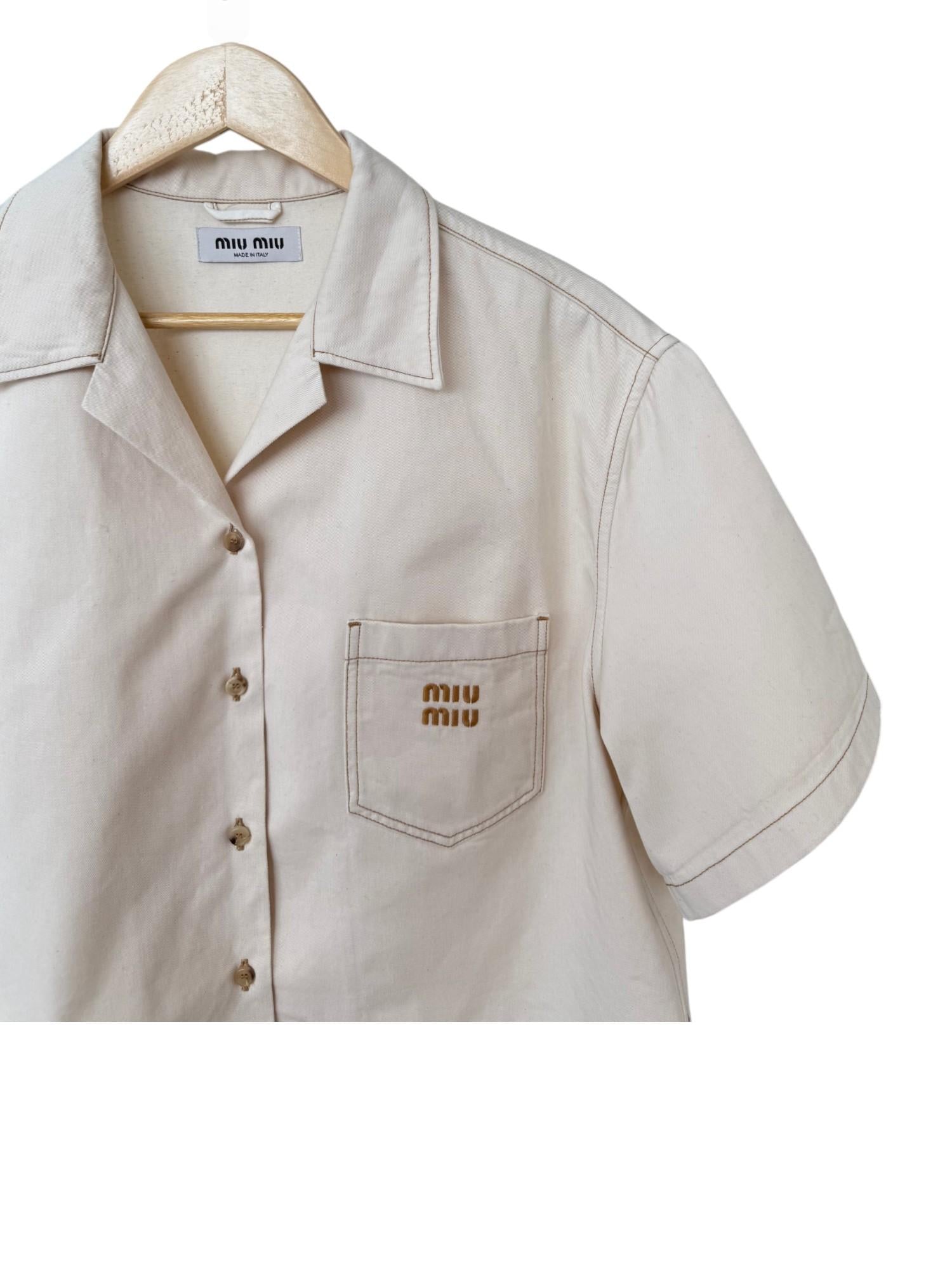 Casual meets luxury in this Miu Miu cropped denim shirt, crafted in a soft beige tone with signature logo embroidery. The boxy fit and short sleeves give it a relaxed yet polished vibe, ideal for styling with high-rise trousers, denim skirts, or layered over a tank top for effortless summer chic. A staple for off-duty days or fashion-forward layering. Gently worn, in excellent condition.