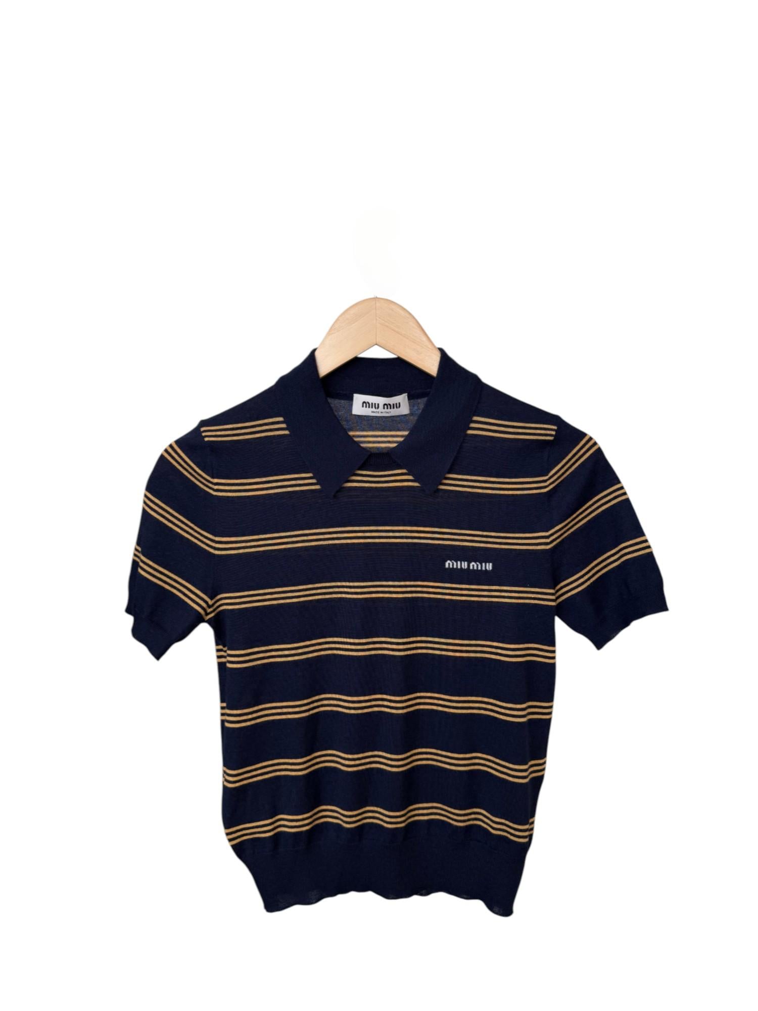 Playful yet polished, this 2025 Miu Miu striped cashmere polo shirt in navy is a wardrobe statement piece, as seen on pop star Cyndi Wang. Crafted in ultra-soft cashmere with a classic polo collar and short sleeves, it blends retro vibes with contemporary chic. Perfect for pairing with high-waisted jeans, pleated skirts, or under a blazer for a preppy twist. Currently available on the official site. Gently worn, in excellent condition.