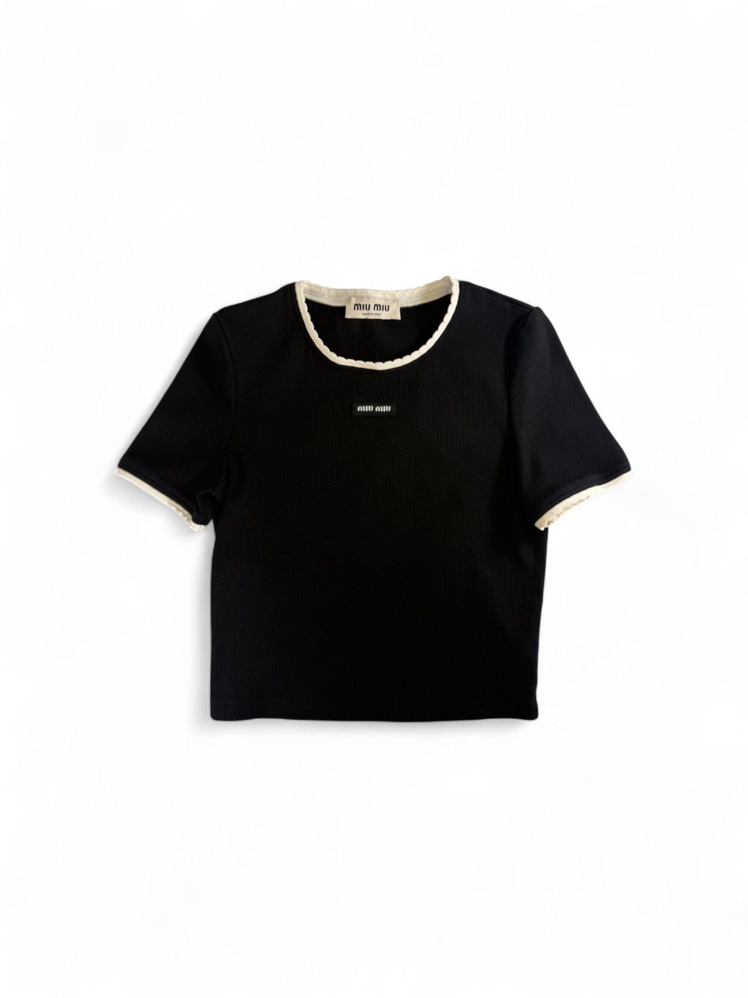 MiuMiu- Black Lace-Trimmed T-Shirt 2023- S