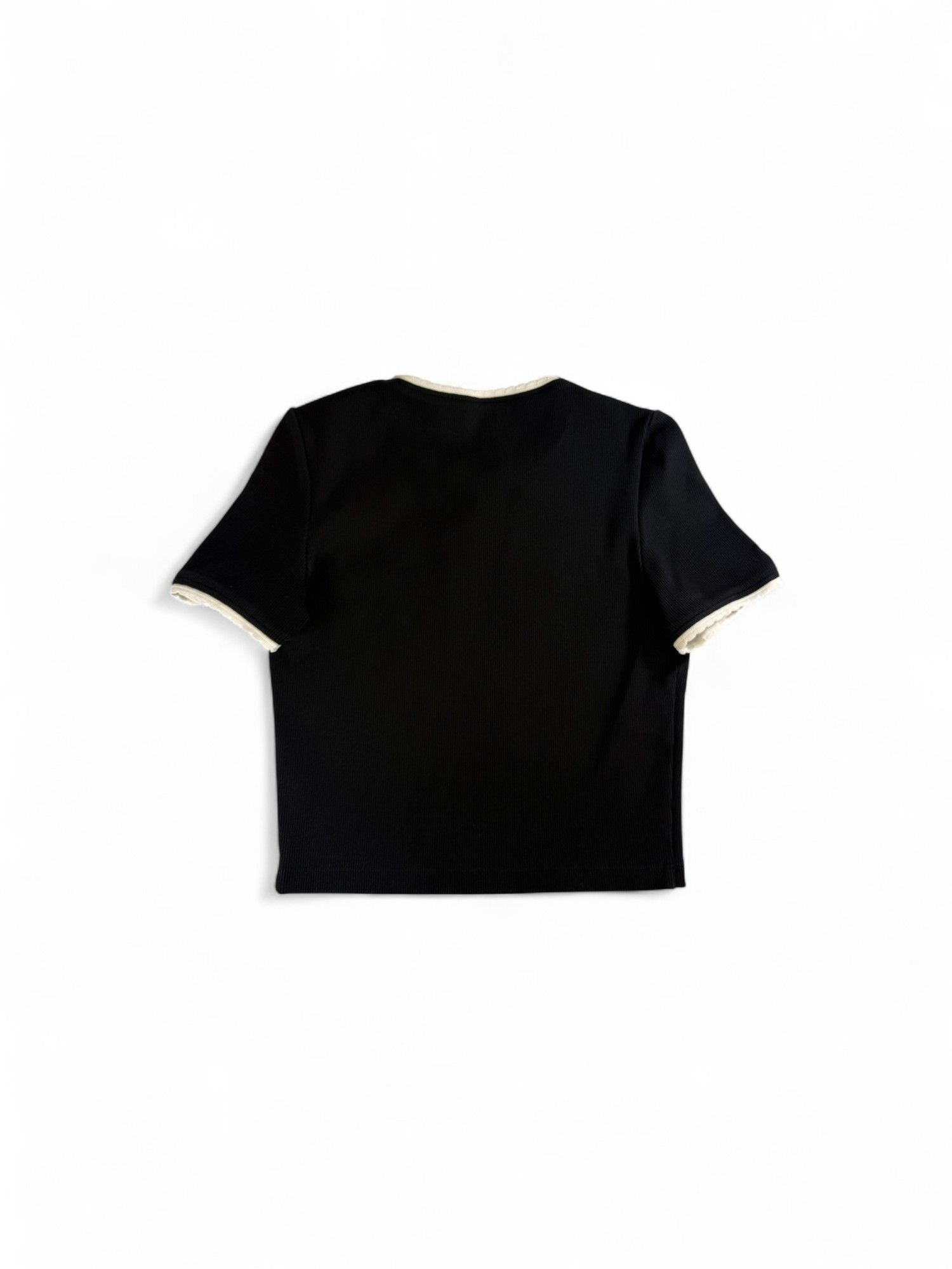 This 2023 Miu Miu black short-sleeve tee redefines casual chic with its delicate contrast detailing. Crafted in a classic crewneck silhouette, it features whimsical white lace trims along the neckline and sleeves for a touch of romantic contrast against the dark base. The chest is subtly branded with a miniature white logo embroidery, maintaining the brand’s signature blend of youthful playfulness and sophistication.