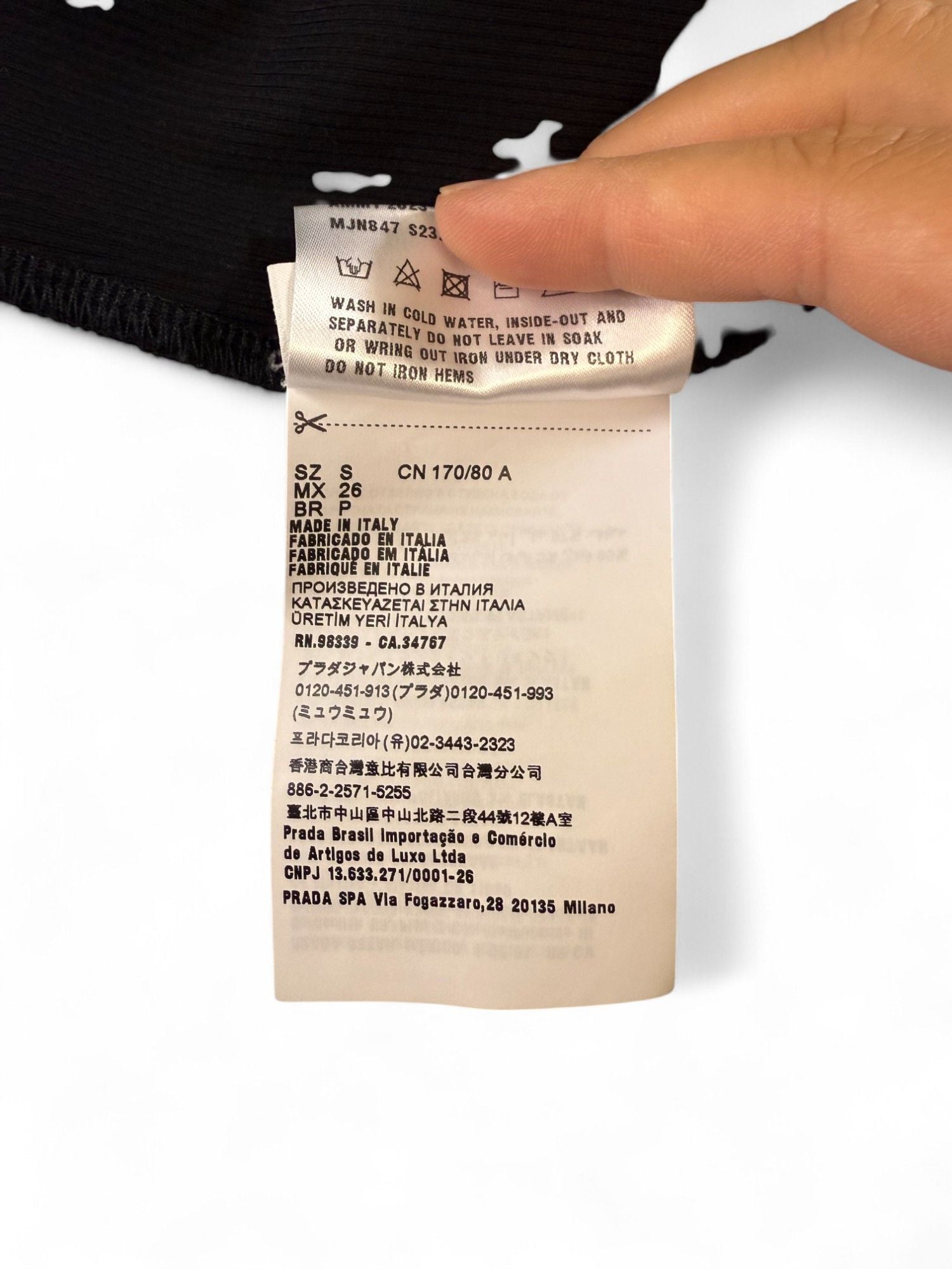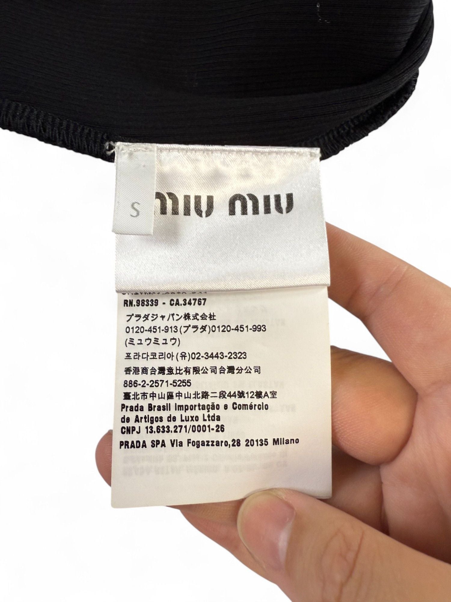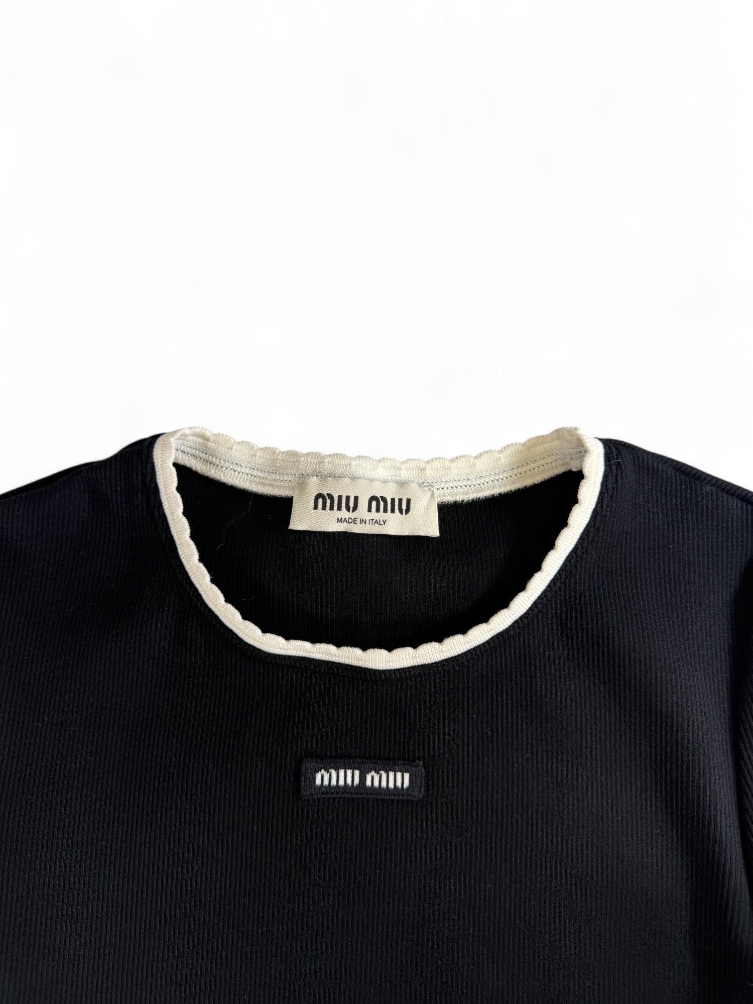 Its slim skims the body gracefully, ideal for styling with high-waisted satin skirts for brunch dates or layered under tailored blazers for office-to-evening transitions. The crisp black-and-white palette ensures versatility—tuck it into vintage denim for a retro vibe, or pair with leather culottes to amplify its edgy femininity. Designed for spring/summer wardrobes, this piece effortlessly bridges daytime errands and cocktail-hour elegance. A polished staple for Miu Miu enthusiasts seeking understated luxury with a whisper of girlish charm.