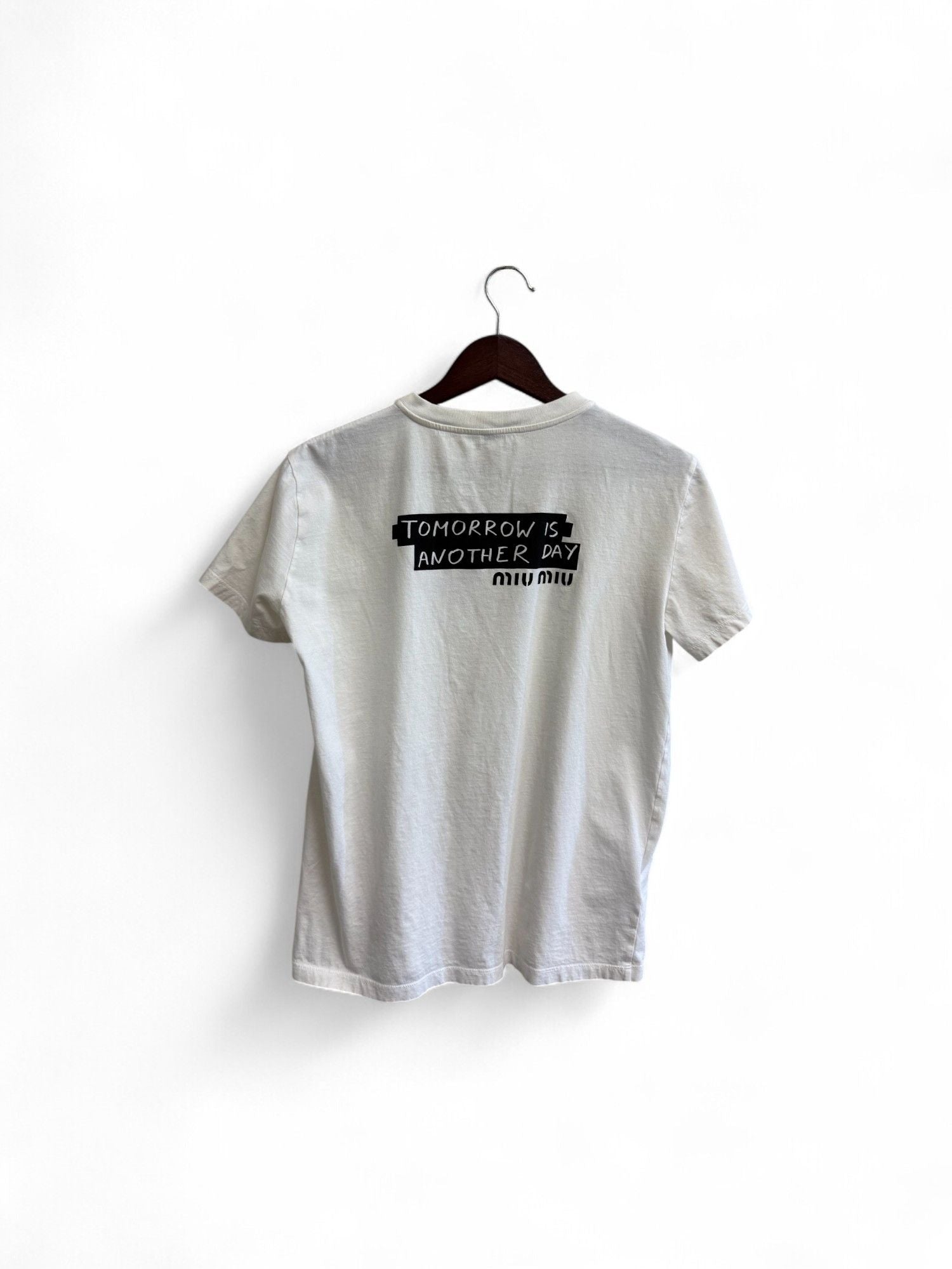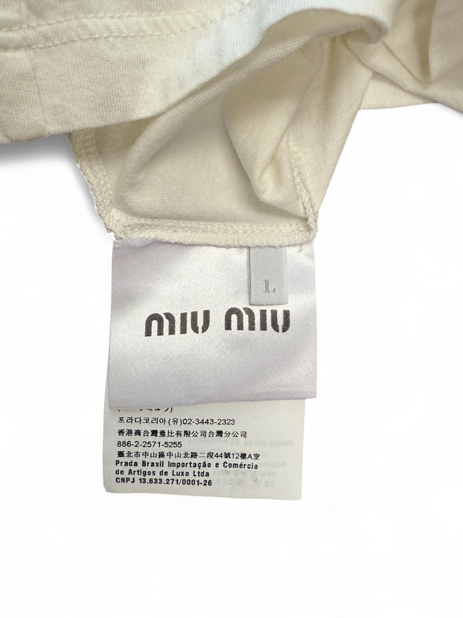 MiuMiu- White Logo Print Cotton Crewneck T-Shirt- L | Retail Price: $390