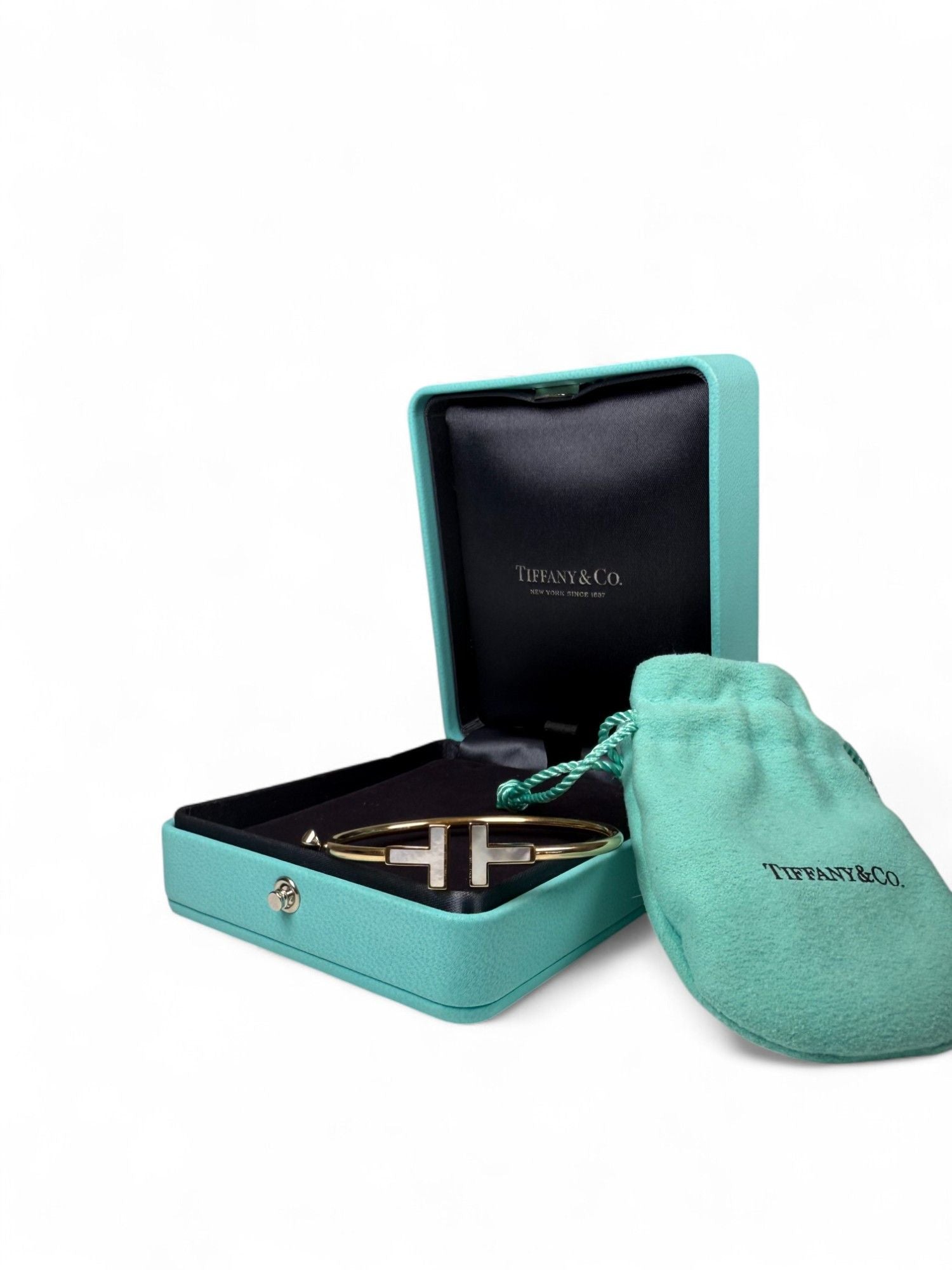 Tiffany & Co. T-Square Mother-of-Pearl Inset 18K Yellow Gold Bangle Bracelet – Retail Price: $3,292